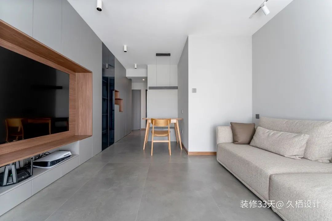 ▲ 灰色电视柜与地砖形成呼应,原木开放格点缀其中凸显层次感