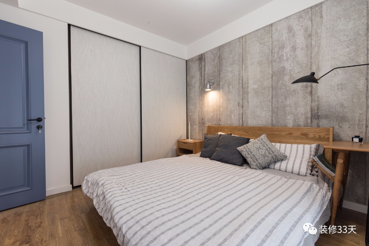 ▲ 主卧,灰色墙纸,原木床和床头柜,配质朴的蓝色窗帘,给人轻松自然的舒适感