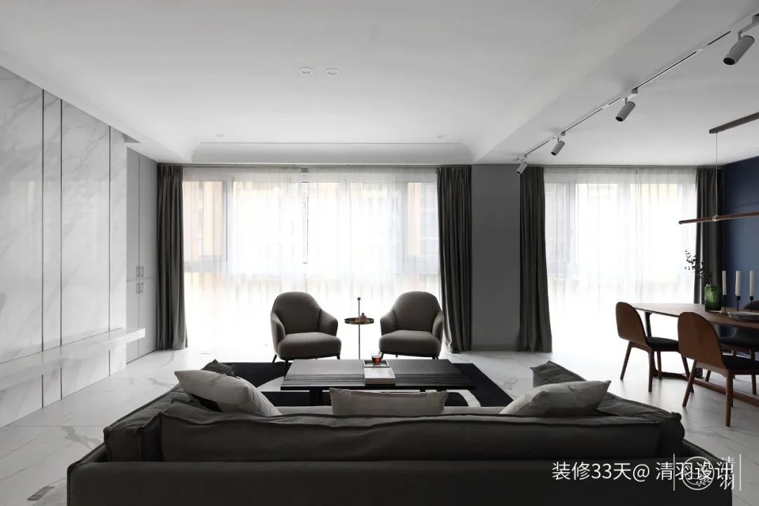▲ 客餐厅为横厅格局,两面大大的落地窗带来充足采光,客厅打破传统沙发正对电视墙的摆放模式,提升居住的合理性和舒适性