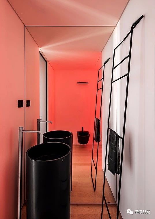 ▲ 淋浴区,迷幻的红灯光使空间呈现一种若隐若现的幻觉,成为一个艺术空间