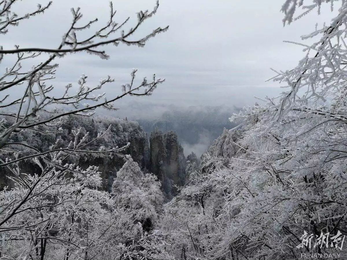 从海拔1500多米的天门山山顶放眼望去,漫山遍野都是白茫茫的一片,景区成了一个银装素裹的冰雪世界。