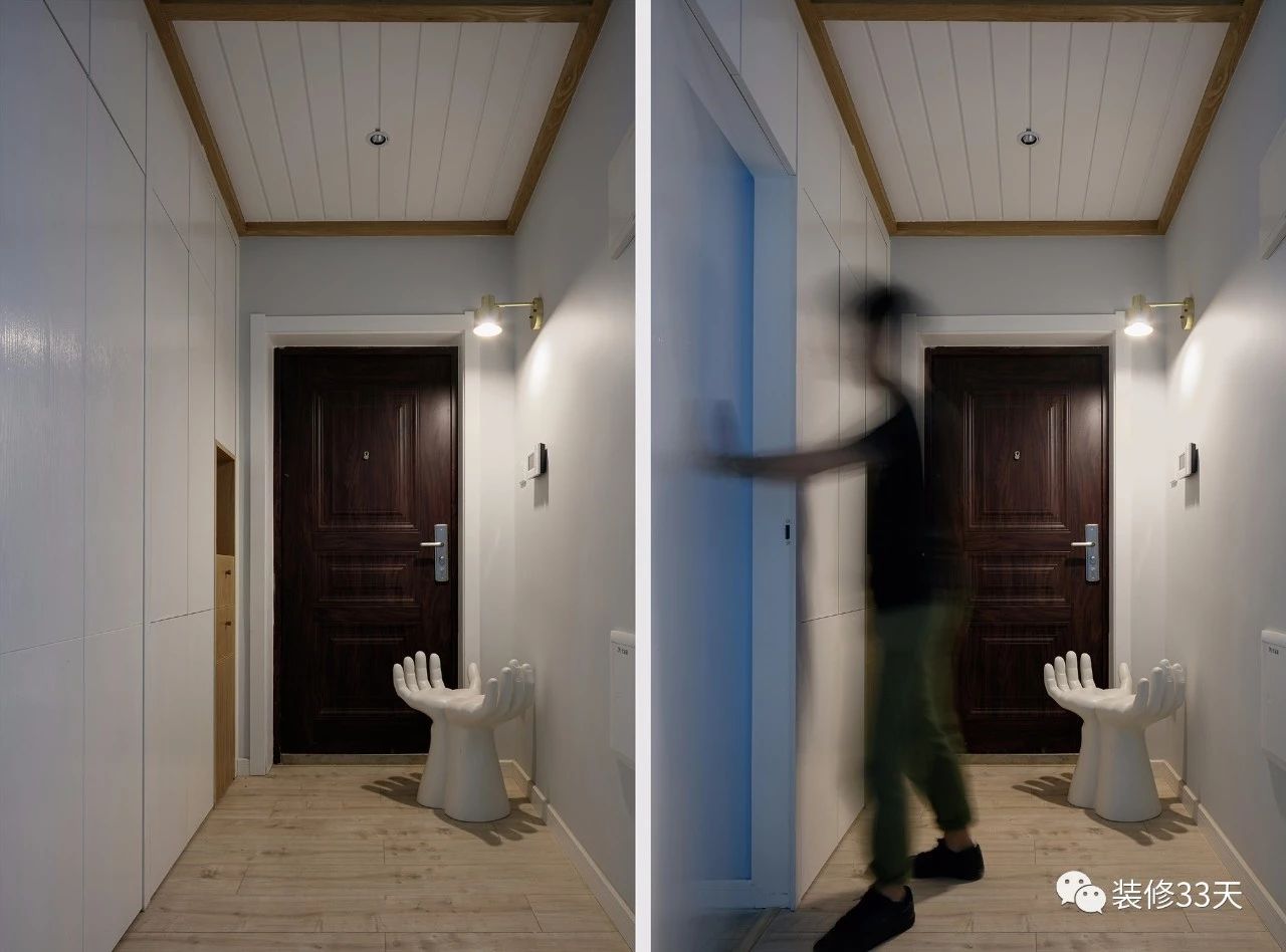 ▲ 玄关暗藏“小心机”,鞋柜拥有充足的储物空间,且与次卧房门连成一体,隐藏式柜门设计,让空间更加简洁大气