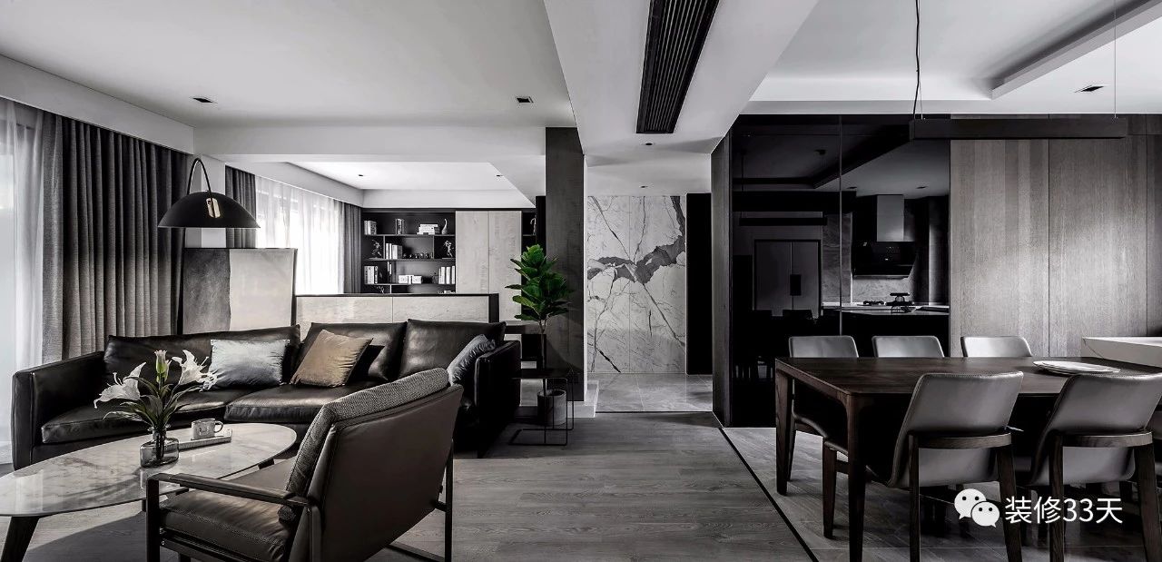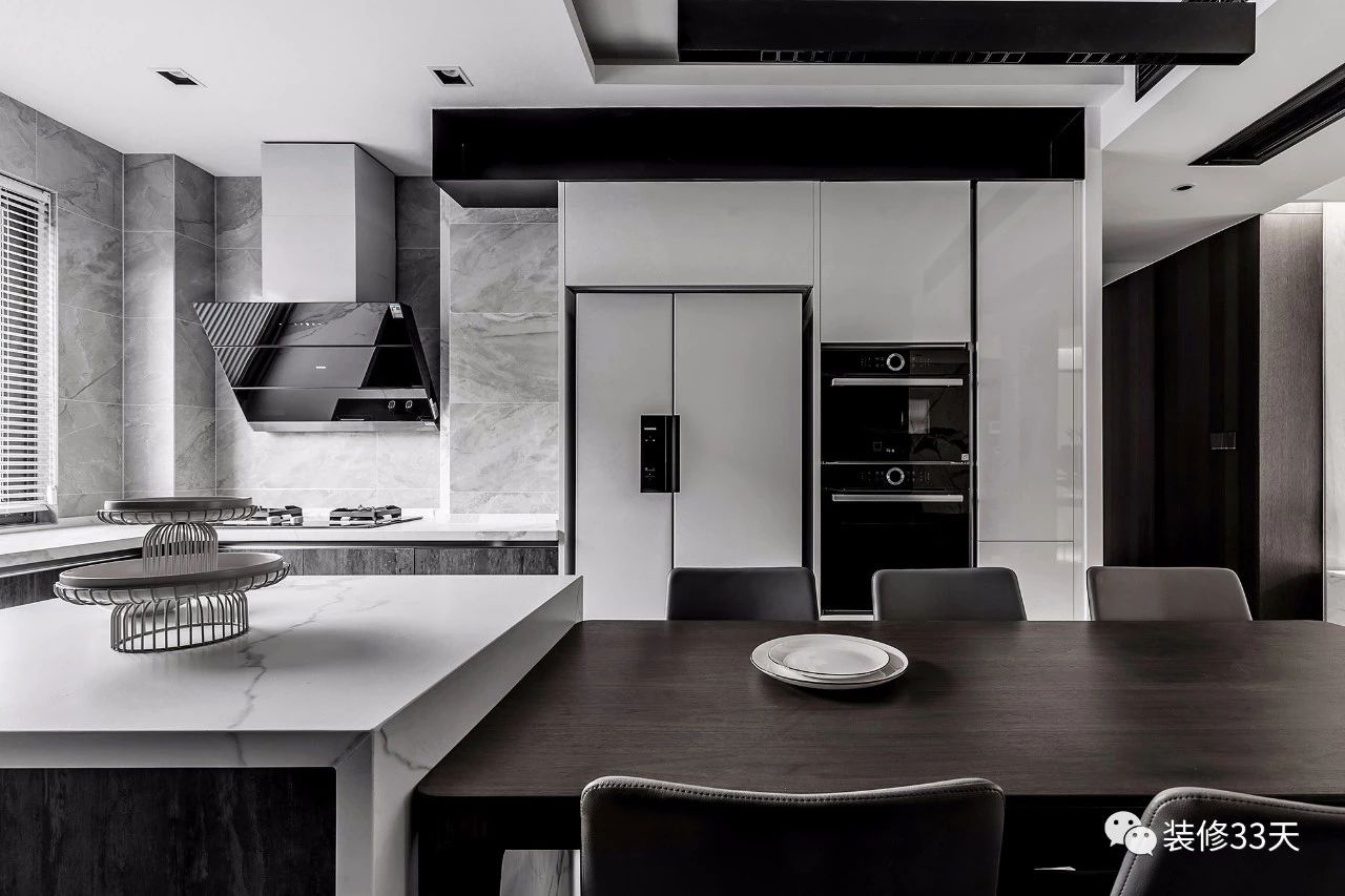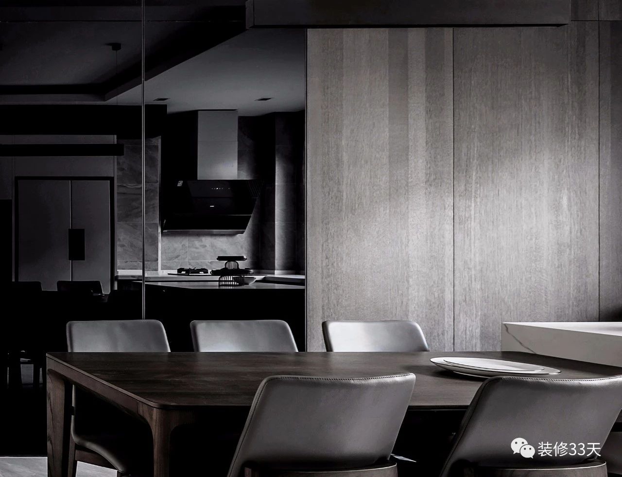 ▲ 餐厅,黑色的凝炼、白色的纯净、灰色的调和,整体延续客厅基调