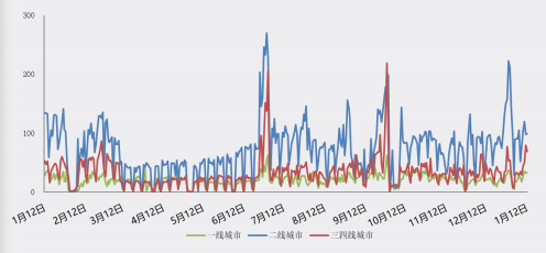 01 月 12 日,一线城市成交指数为 33.06,环比上涨 0.37%,广州上涨 1.84%; 二线城市成交指数为 99.34,环比上涨 1.10%,杭州上涨 19.79%;三线城市成 交指数为 69.19,环比下跌 10.64%,舟山下跌 13.80%。一、二线城市成交指 数较昨日上涨。