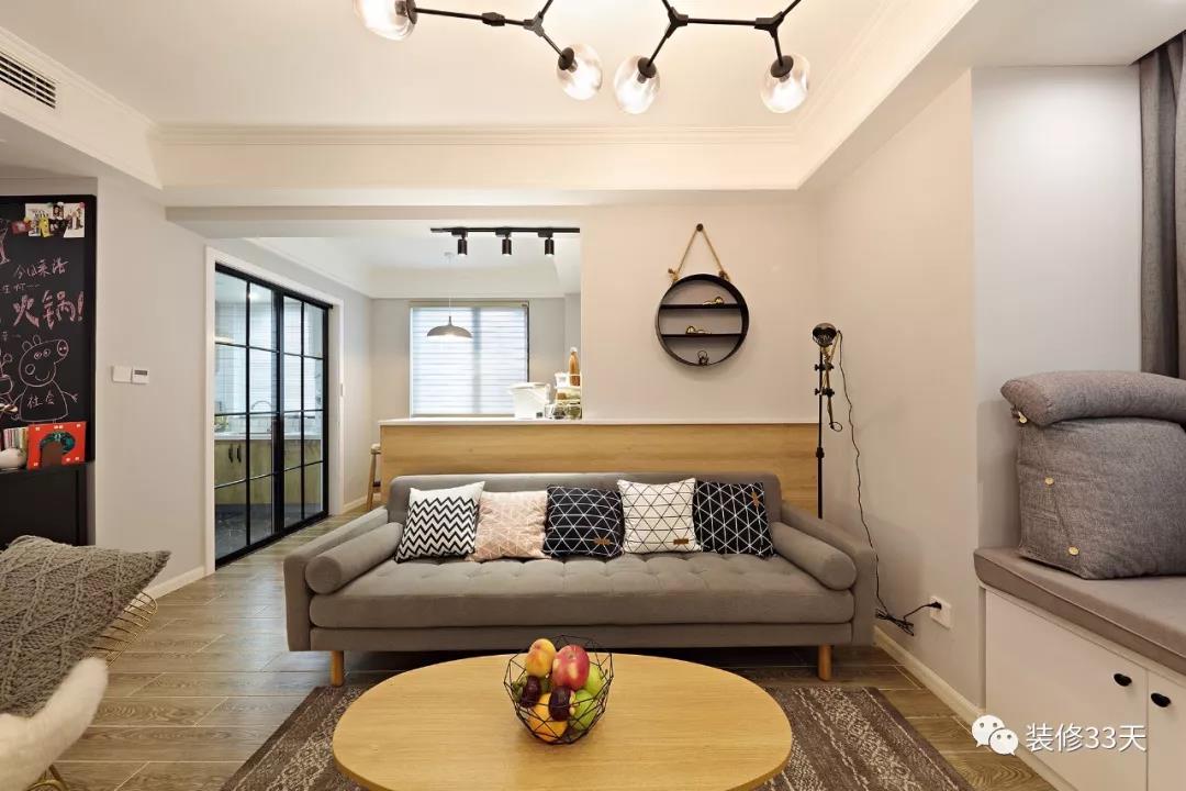 ▲ 灰色主沙发依靠木皮包裹的半墙隔断,北欧风家具与灯饰更显家的温馨