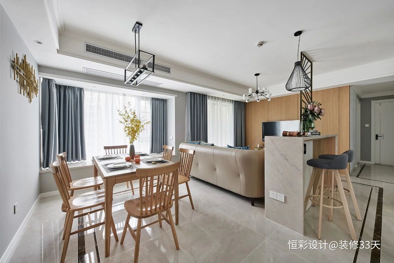 ▲ 餐厅,线条简单的原木餐桌椅搭配餐边柜设计,原木元素的大量使用让整个家居空间看上去格外地柔和,富有自然气息