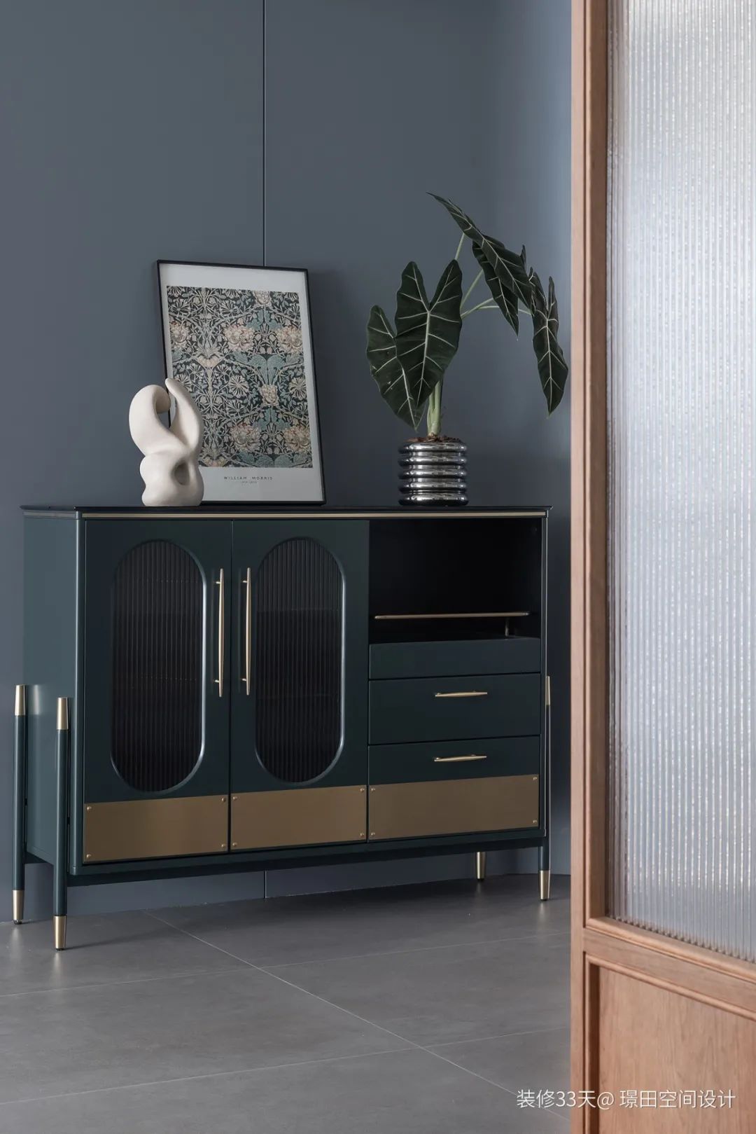 ▲ 进门视角,整个起居室的电视背景和主卧隐形门相结合,形成完整饰面,复古的装饰柜让空间增加丰富错落的层次