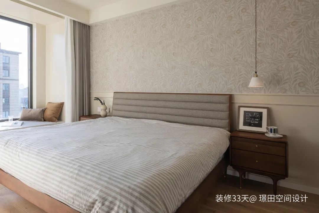 ▲ 休闲飘窗与大床之间空间宽敞,床头的实木柜体型可爱,方便置物